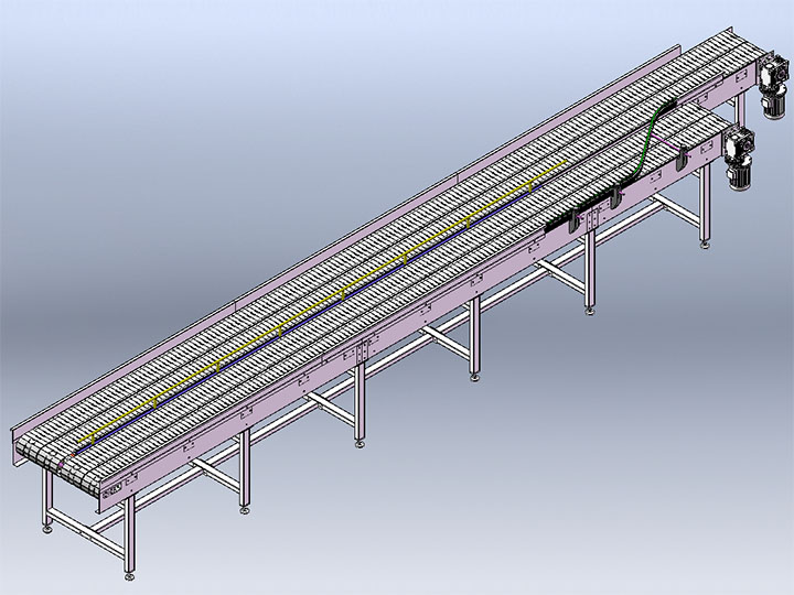 鏈板輸送機是一種以標準鏈板為承載面,由馬達減速機為動力傳動的傳送裝置。鏈板式輸送機,由動力裝置(電機)、傳動軸、滾筒、張緊裝置、鏈輪、鏈條、軸承、潤滑劑、鏈板等等構成。其中帶動物料的輸送的主要的兩個部分為:鏈條,利用它的循環往復運動提供牽引動力;金屬板,作為輸送過程中的承載體。可以通過多列鏈板并行,使鏈板輸送機做的很寬并形成差速,利用多列鏈板的速度差使多列輸送在無擠壓的情況下變為單列輸送,從而滿足飲料貼標、灌裝、清洗等設備的單列輸送的要求,我們可以將兩條鏈板輸送機的頭尾部做成重疊式的混合鏈使得瓶(罐)體處于動態過度狀態,使輸送線上不滯留物料,可以滿足空瓶以及實瓶壓力和無壓力輸送。